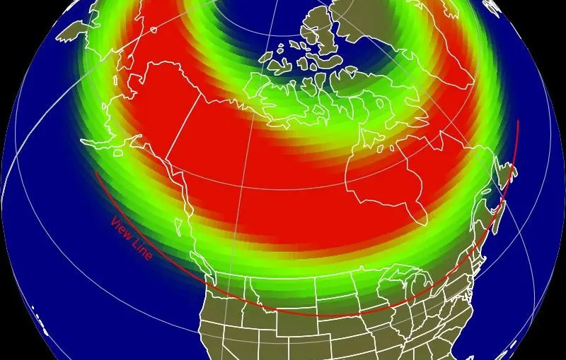 根據太空天氣預報中心周二下午3時發出的預報圖,晚上有機會看見北極光的地區外緣界線(上圖紅線),幾乎覆蓋了整個加拿大以及美國北部的邊境地區。