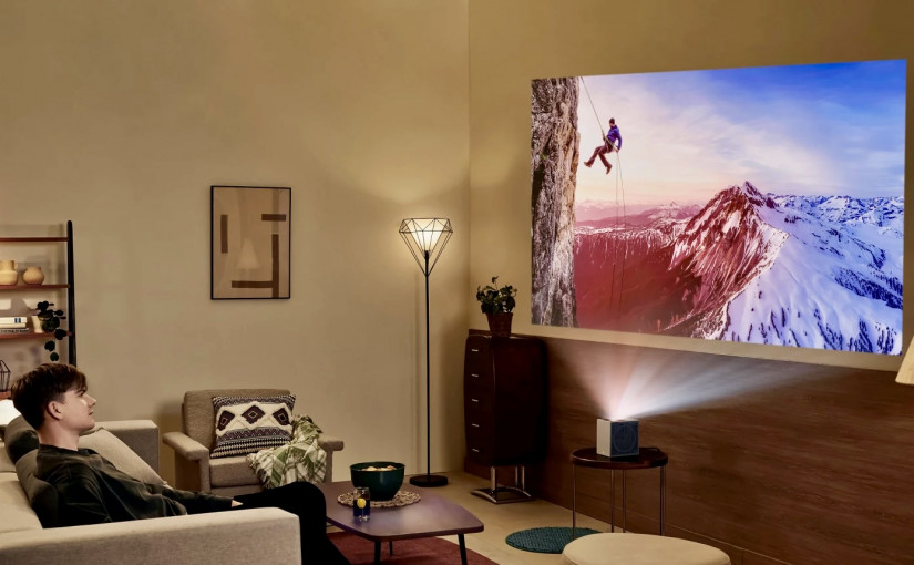 該影片似乎暗示此機種無需插電即可運作,但實際上它不含內建電池,會隨機附贈 65W USB-C 變壓器。插電後即可投影出最大片幅達 100 吋對角線的 4K UHD 影像,其 投射比為 0.25:1 —— 即機器只需距離垂直投影面 39.3 公分(15.5 英吋) 即可顯示最大畫面。