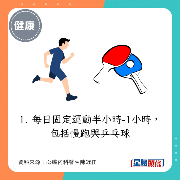 - 每日固定運動半小時至1小時,包括慢跑與乒乓球