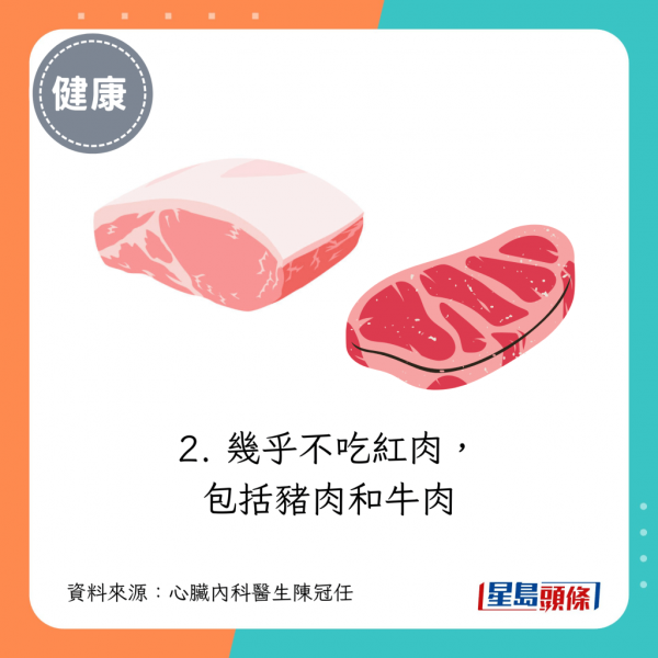 - 幾乎不吃紅肉,包括豬肉和牛肉