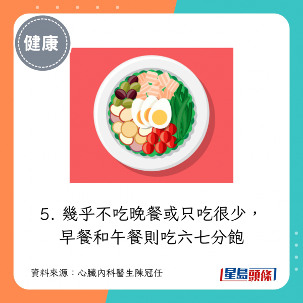 - 幾乎不吃晚餐或只吃很少,早餐和午餐則吃六七分飽