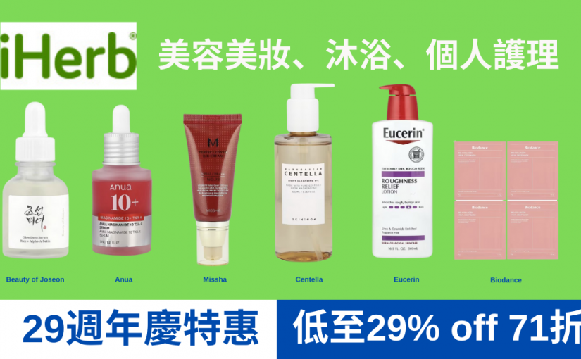 iHerb 今年迎來 29 週年慶 !全站多個類別推出限時 29% OFF 71折 優惠,美妝及個人護理產品當然唔少得。對於愛美一族,呢次絕對是入貨同試新產品嘅最佳時機。只要購物時輸入特惠碼【29BBPC】便可享有71折優惠! 尤其是喜愛韓國化妝護膚品的小編, 一定不會錯過這個黃金機會!