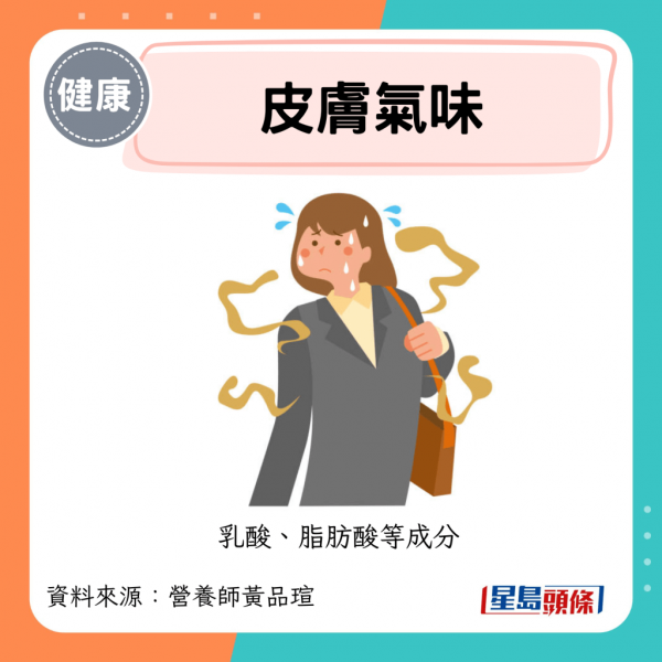 高蛋白或重口味飲食如大量紅肉、燒烤等食物,其蛋白質與脂肪代謝產物經由汗液排出,讓身體散發更多氣味,雖非主要因素,但可能成為輔助訊號。