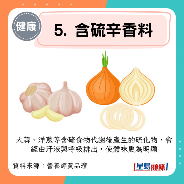 大蒜、洋蔥等含硫食物代謝後產生的硫化物,會經由汗液與呼吸排出,使體味更為明顯。