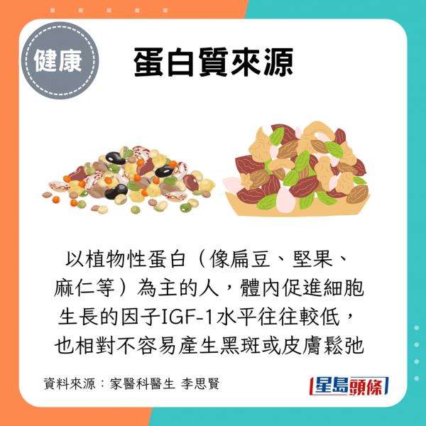 而且,那些以植物性蛋白(如扁豆、堅果、麻仁等)為主的人,體內IGF-1水平往往較低,也相對不容易產生黑斑或皮膚鬆弛。