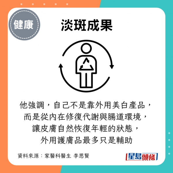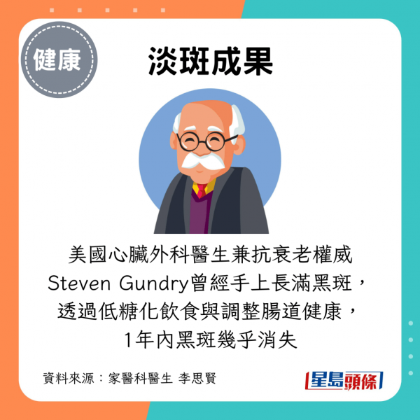 家醫科醫生李思賢在Facebook專頁發文,引述美國心臟外科醫生兼抗衰老權威Steven Gundry的觀點指,老人斑原來是全身正在老化的警訊。當皮膚上開始出現這些黑斑,代表同樣的氧化與纖維化反應,亦正在心臟、腦和肺裡發生,反映著體內發炎與代謝失衡,而老人斑其實只是「纖維化」在皮膚上的可見表現。