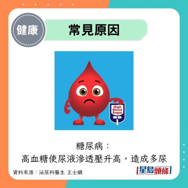 - 糖尿病:高血糖使尿液滲透壓升高,造成多尿。