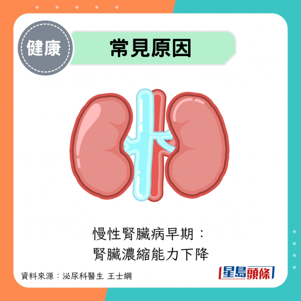 - 慢性腎臟病早期:腎臟濃縮能力下降。