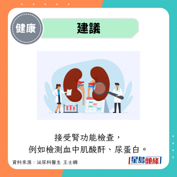 - 接受腎功能檢查,例如檢測血中肌酸酐、尿蛋白。