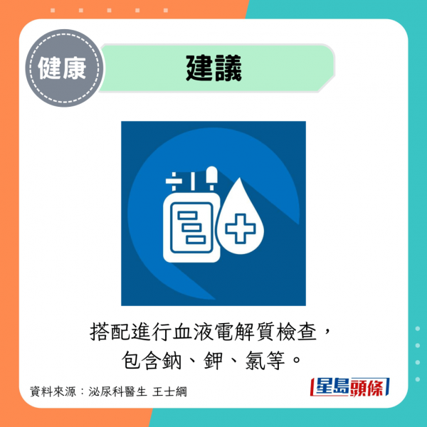 - 搭配進行血液電解質檢查,包含鈉、鉀、氯等。