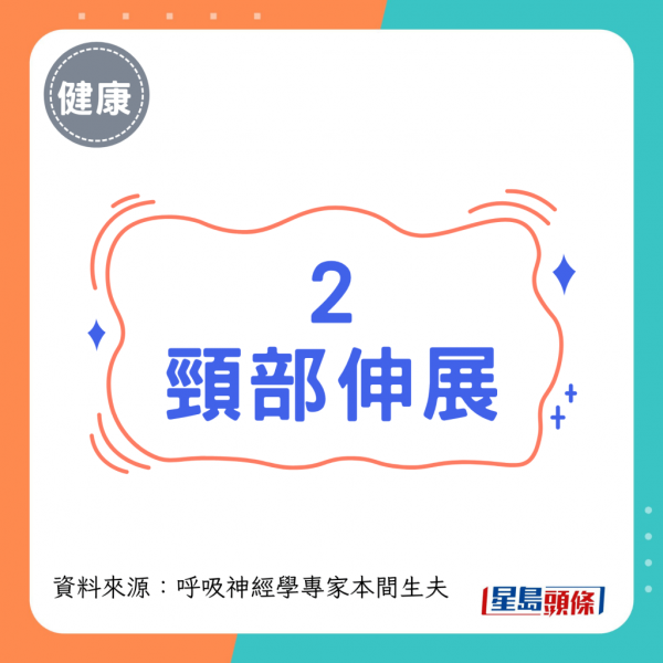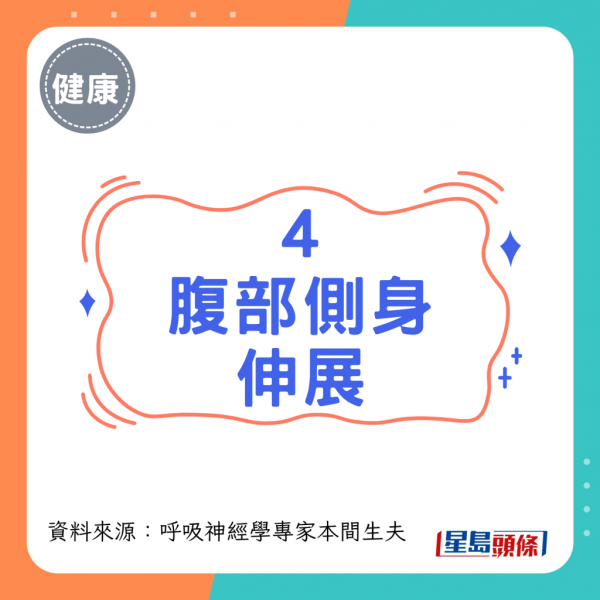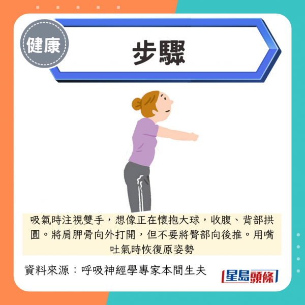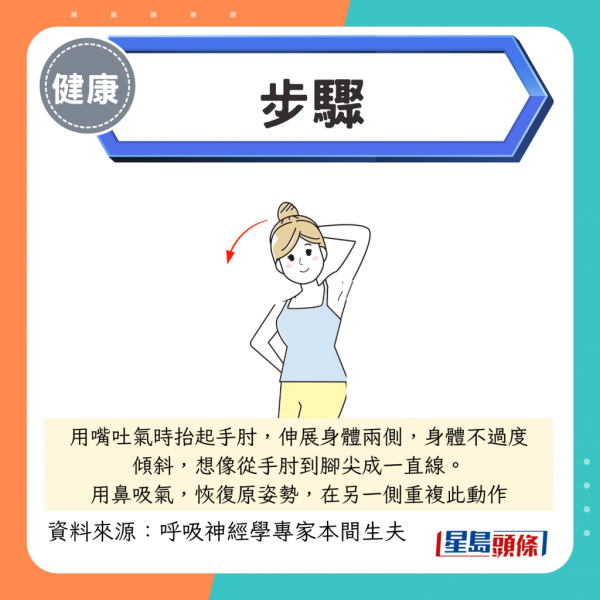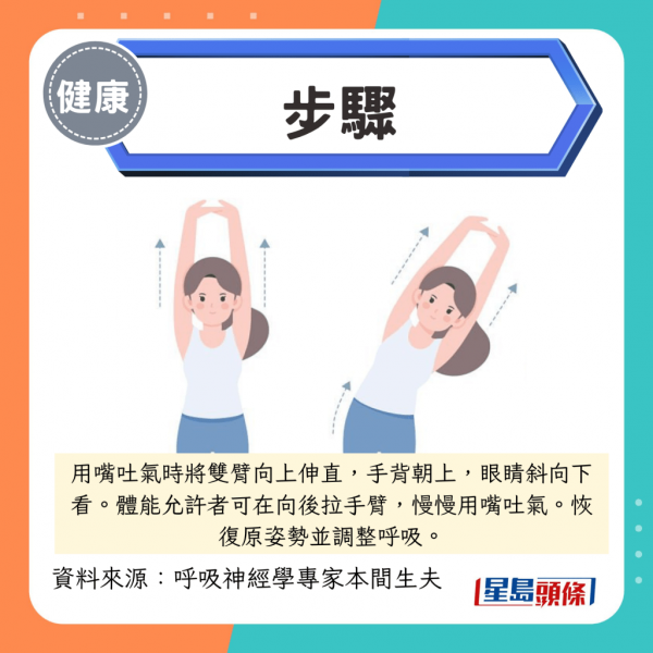 本間生夫強調,想維持呼吸功能達至健康長壽,第一步就是「鼻呼吸」。隨年齡增長,肺部及周邊的呼吸肌約在60歲前後老化,屆時僅靠鼻呼吸已不足夠。因此,本間生夫設計了以下6招「呼吸肌伸展法」,建議每日分數組執行,各動作進行3-6次,站立困難者,坐著進行亦可: