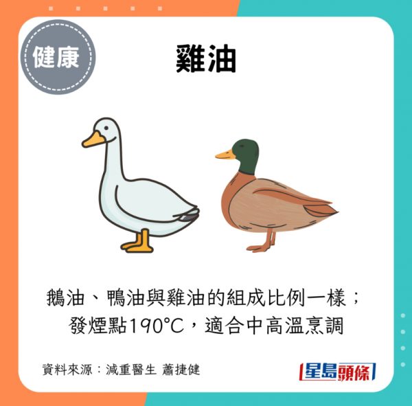蕭醫生表示,同是動物油,家禽油比起豬牛的脂肪更不容易增加膽固醇,反映了改吃白肉的好處;而且即使豬油比牛油健康,也不代表它是好油,可放任自己天天吃豬油撈飯。