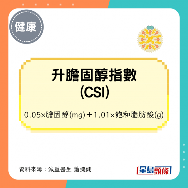 - 計算CSI公式=0.05 × 膽固醇(mg)+ 1.01 × 飽和脂肪酸(g)