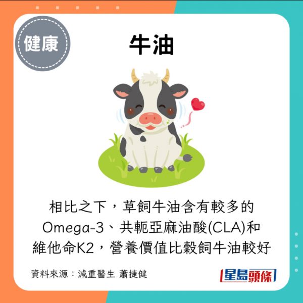 飽和脂肪最高,應盡量少攝取。相比之下,草飼牛油含有較多的Omega-3、共軛亞麻油酸(CLA)和維他命K2,營養價值比穀飼牛油較好。牛油發煙點150°C,不適合油炸之類的高溫烹調。