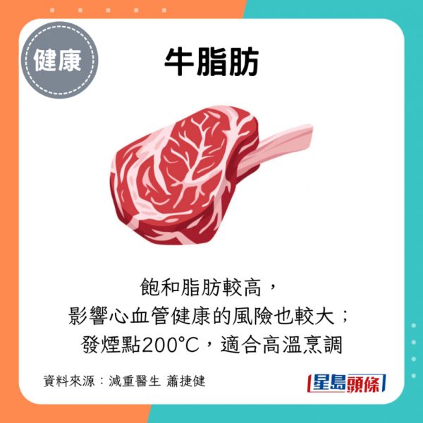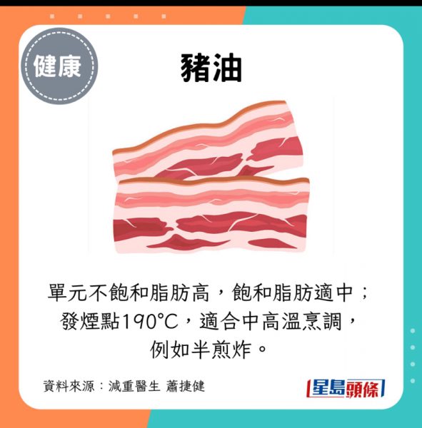 蕭醫生表示,同是動物油,家禽油比起豬牛的脂肪更不容易增加膽固醇,反映了改吃白肉的好處;而且即使豬油比牛油健康,也不代表它是好油,可放任自己天天吃豬油撈飯。