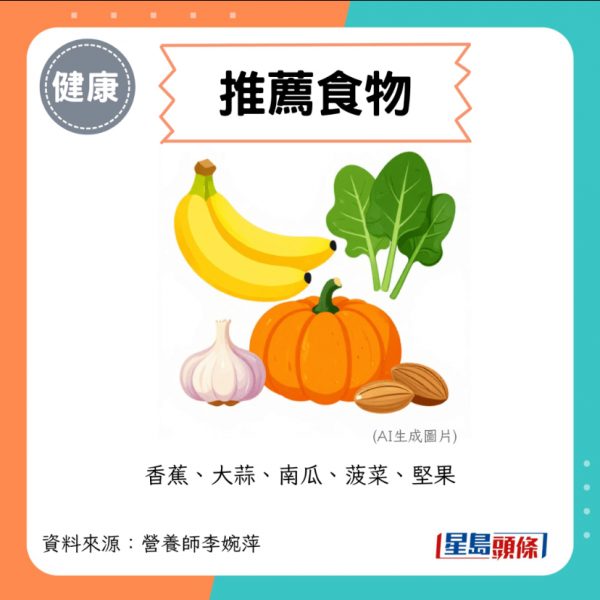 - 推薦食物: 香蕉、大蒜、南瓜、菠菜、堅果。