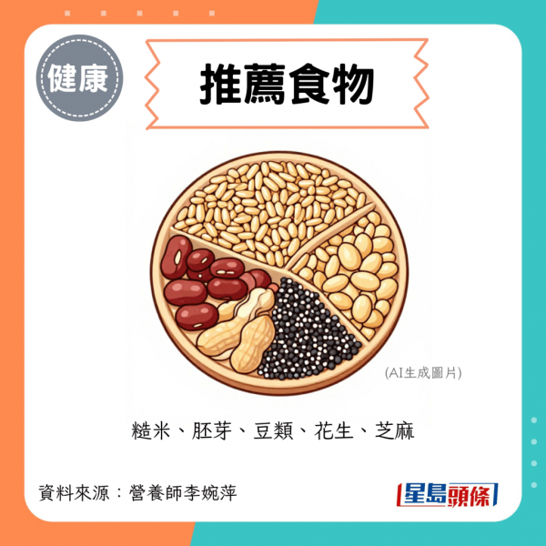 - 推薦食物:全榖雜糧類(糙米、胚芽)、豆類、花生、芝麻。