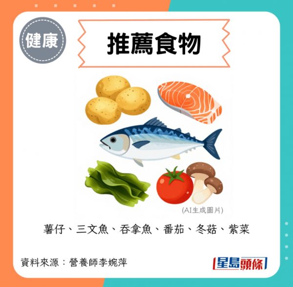 - 推薦食物: 薯仔、三文魚、吞拿魚、番茄、冬菇、紫菜。