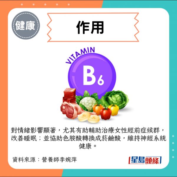 - 作用:對情緒影響顯著,尤其有助輔助治療女性經前症候群,改善睡眠;並協助色胺酸轉換成菸鹼酸,維持神經系統健康。