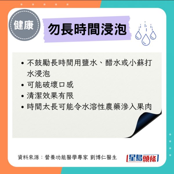 他強調,最新的食安建議已經不鼓勵長時間用鹽水、醋水或小蘇打水浸泡水果,此舉不只可能破壞口感,而且清潔效果有限,時間太長甚至可能令水溶性農藥滲入果肉,得不償失。