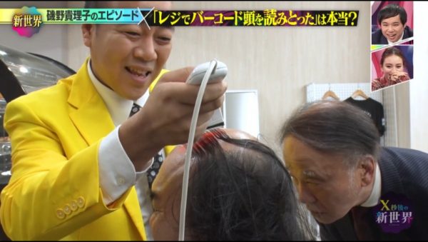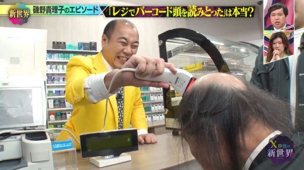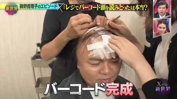 日本綜藝節目《X秒後の新世界》近日進行了一場搞笑實驗,將2位禿頭男藝人的「僅存髮絲」修剪及排列成條碼,測試頭髮能否成功被機器讀取!該實驗源自女演員磯野貴理子在便利店打工的親身經歷,她曾用掃描器意外掃到彎腰禿頭客人的頭頂,收銀機更發出「嗶」聲並顯示10日圓價格。