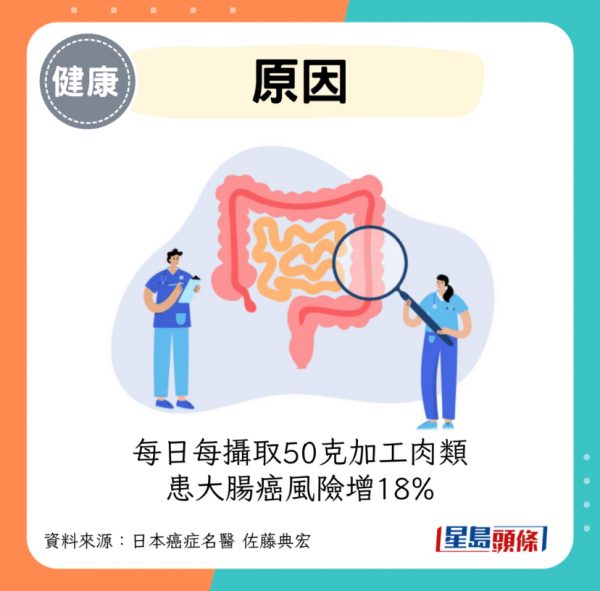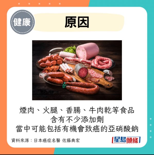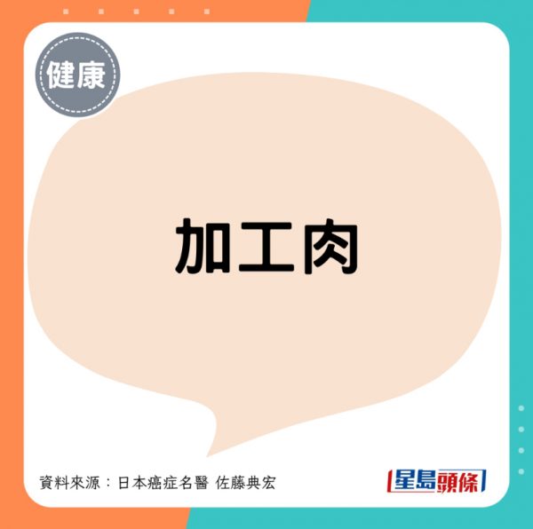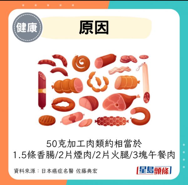 佐藤教授表示,煙肉、火腿、香腸、牛肉乾等食品含有不少添加劑,當中可能包括有機會致癌的亞硝酸鈉。有研究指,每日每攝取50克加工肉類,患大腸癌的風險會增18%,50克加工肉類大約相當於1.5條香腸或2片煙肉或2片火腿或3塊午餐肉。