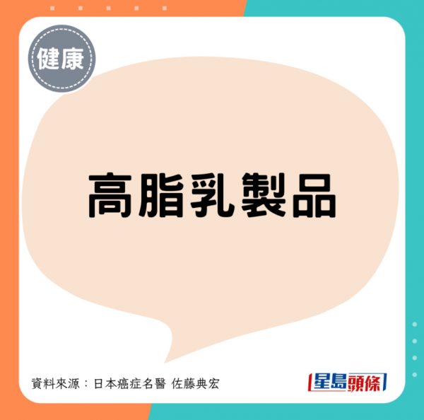 佐藤教授認為,乳製品的脂肪含量會影響致癌風險,而一般連鎖咖啡店中常見的非咖啡類含糖飲品,表面通常有好幾圈鮮忌廉,事實上這些鮮忌廉的脂肪含量一般較高,如果經常飲用有機會增患大腸癌風險。如果每天早餐素有喝牛奶或乳酪的習慣,則建議選購低脂產品,反而有助降患大腸癌風險。
