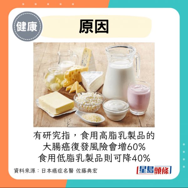 佐藤教授引述一項針對逾2000名大腸癌患者的研究指,食用低脂乳製品的大腸癌復發風險可降40%;相反,攝取一般乳製品的大腸癌復發風險則會增60%。