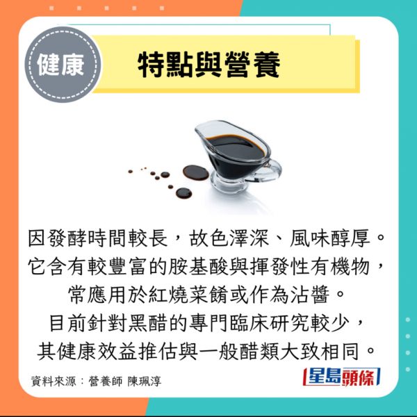 黑醋因發酵時間較長,故色澤深、風味醇厚,含有較豐富的胺基酸與揮發性有機物,常應用於紅燒菜餚或作為蘸醬。需注意的是,市面上的黑醋在製作過程中通常添加較多鹽分,其鈉含量比米醋或蘋果醋更高,因此若經常大量使用,可能增加鈉攝取過量的風險。目前針對黑醋的專門臨床研究較少,其健康效益推斷與一般醋類大致相同。