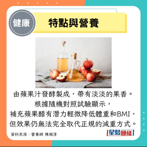由蘋果汁發酵製成,帶有淡淡的果香。近年來被廣泛宣傳為養生飲品,市面上常見稀釋後飲用的產品。根據隨機對照試驗顯示,補充蘋果醋確實有潛力輕微降低體重和BMI,但其效果仍無法完全取代正規的減肥方式。