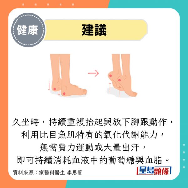 久坐時,重複抬起與放下腳跟的動作,利用比目魚肌特有的氧化代謝能力,無需費力運動或大量出汗,即可持續消耗血液中的葡萄糖與血脂。