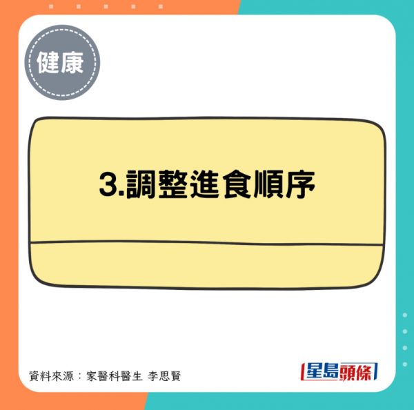 嚴格遵循先吃含纖維的蔬菜,再吃蛋白質或油脂,最後吃碳水化合物食物的進食順序。透過膳食纖維延緩胃部排空速度,有助於平穩餐後血糖波動。