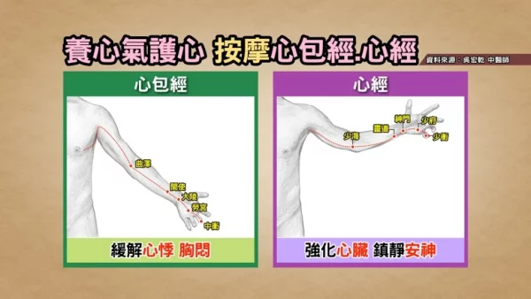 情緒也會影響心臟,特別是怒氣。吳宏乾醫師建議按摩另一條經絡「心經」:包括少海、靈道、神門、少府和少衝穴,有助緩和情緒,調養心神,改善心火和肝火。早晚各5分鐘,從肘窩內側,順著手臂內側往下刮,一直到尾指尖,幫助養心安神,避免情緒傷及心肝。