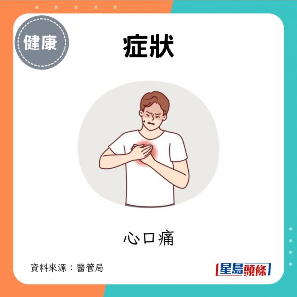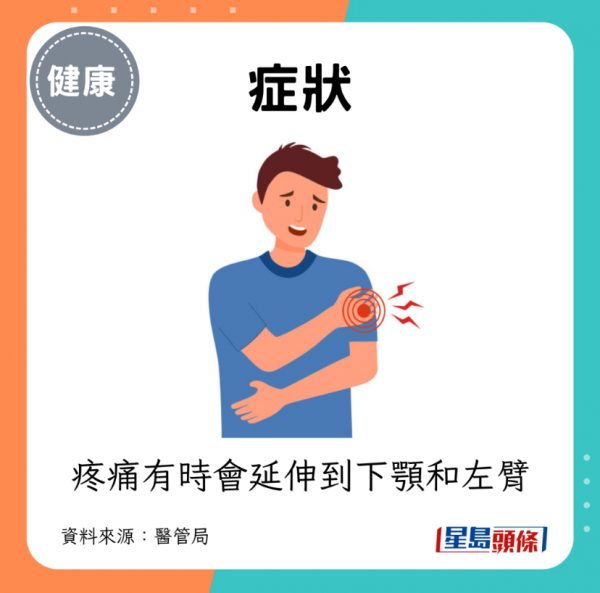 - 典型症狀:心口痛和胸部不適,有時更會延伸到下顎和左臂,冒汗和呼吸困難。