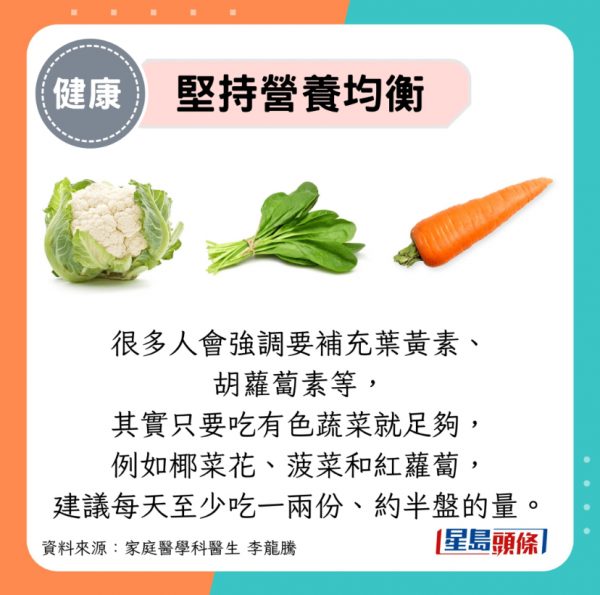 此外,他特別喜歡食用木耳與芹菜,除了富含膳食纖維,還有助清血、降低中風與心肌梗塞風險。李醫生直言,很多人會強調要補充葉黃素、胡蘿蔔素等,其實只要吃有色蔬菜就足夠,例如椰菜花、菠菜和紅蘿蔔,建議每天至少吃一兩份、約半盤的量。