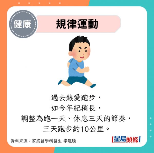 李龍騰醫生表示,過去熱愛跑步,如今年紀稍長,調整為跑一天、休息三天的節奏,三天跑步約10公里。