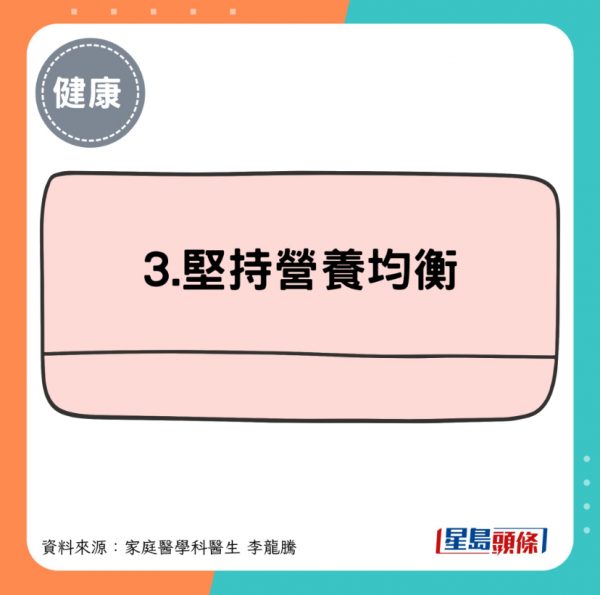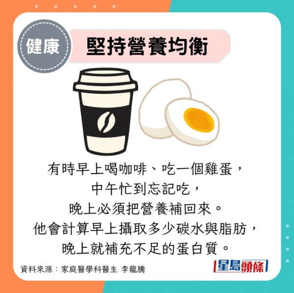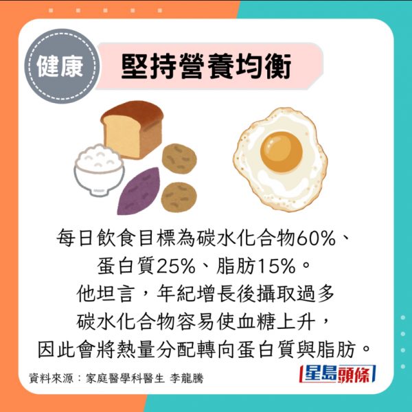李醫生每日飲食目標為碳水化合物60%、蛋白質25%、脂肪15%。但他坦言,年紀增長後攝取過多碳水化合物容易使血糖上升,因此會將熱量分配轉向蛋白質與脂肪。他分享:「有時早上喝咖啡、吃一個雞蛋,中午忙到忘記吃,晚上必須把營養補回來」。因此,他會計算早上攝取多少碳水與脂肪,晚上就補充不足的蛋白質。