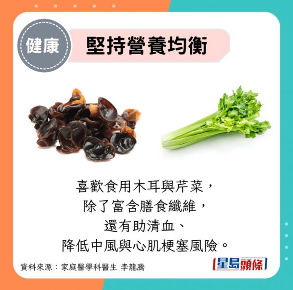 此外,他特別喜歡食用木耳與芹菜,除了富含膳食纖維,還有助清血、降低中風與心肌梗塞風險。李醫生直言,很多人會強調要補充葉黃素、胡蘿蔔素等,其實只要吃有色蔬菜就足夠,例如椰菜花、菠菜和紅蘿蔔,建議每天至少吃一兩份、約半盤的量。
