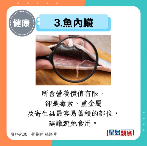 所含營養價值有限,卻是毒素、重金屬及寄生蟲最容易蓄積的部位,建議避免食用。