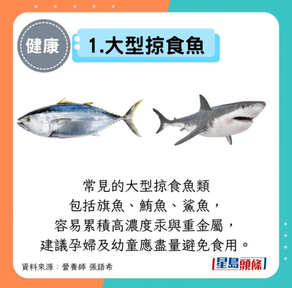 常見的大型掠食魚類包括旗魚、鮪魚、鯊魚,容易累積高濃度汞與重金屬,建議孕婦及幼童應盡量避免食用。