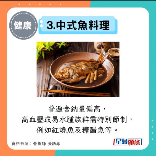 普遍含鈉量偏高,高血壓或易水腫族群需特別節制,例如紅燒魚及糖醋魚等。