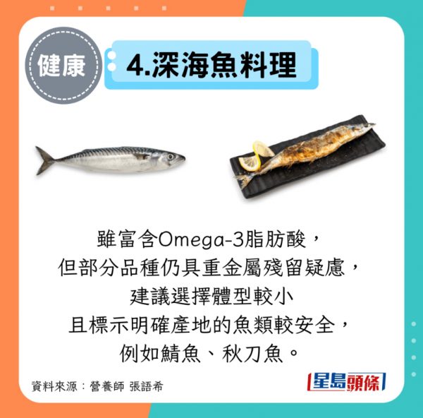 雖富含Omega-3脂肪酸,但部分品種仍具重金屬殘留疑慮,建議選擇體型較小且標示明確產地的魚類較安全,例如鯖魚、秋刀魚。