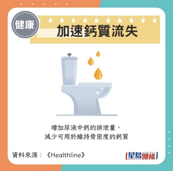 1. 加速鈣質流失:增加尿液中鈣的排泄量,減少可用於維持骨密度的鈣質。