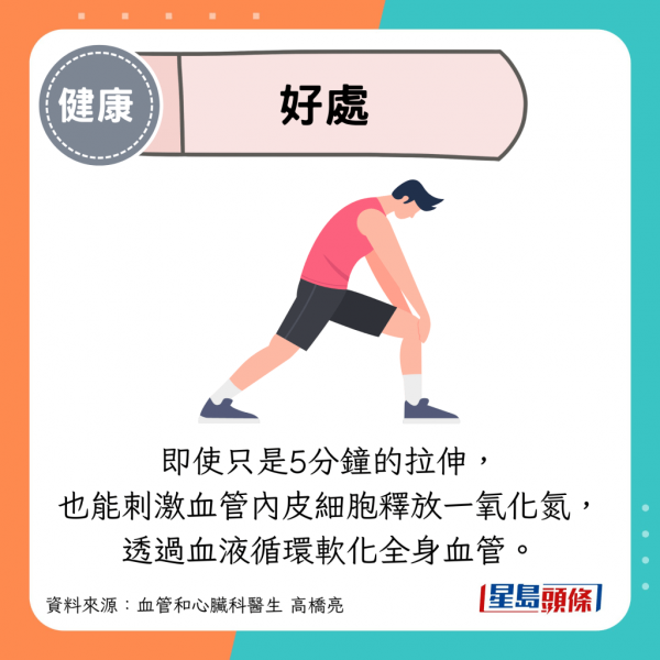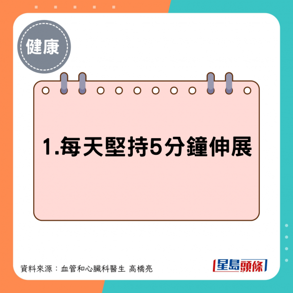 為改善健康,他原本嘗試每天步行30分鐘,但雨季來臨後便難以持續。後來他發現,其實可以從5分鐘開始,例如在電視廣告空檔進行伸展。即使只是5分鐘的拉伸,也能刺激血管內皮細胞釋放一氧化氮,透過血液循環軟化全身血管。