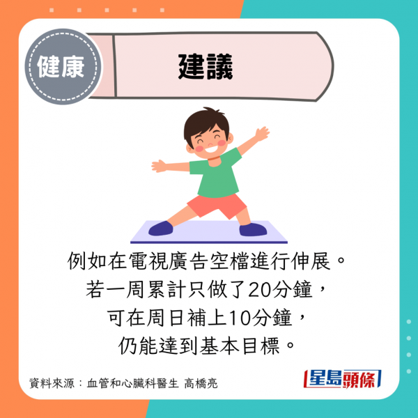 若一周累計只做了20分鐘,可在周日補上10分鐘,仍能達到基本目標。有研究建議,每周進行150分鐘中等強度或75分鐘高強度運動以維持健康,但對不習慣運動的人而言,突然每周運動150分鐘並不容易,因此可先從每周30分鐘開始培養習慣。