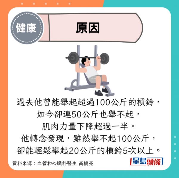 過去他曾能舉起超過100公斤的槓鈴,如今卻連50公斤也舉不起,肌肉力量下降超過一半。但他轉念發現,雖然舉不起100公斤,卻能輕鬆舉起20公斤的槓鈴5次以上。從能量消耗角度,全力舉起100公斤1次消耗的能量為100公斤,而舉起20公斤10次則相當於消耗能量為200公斤。