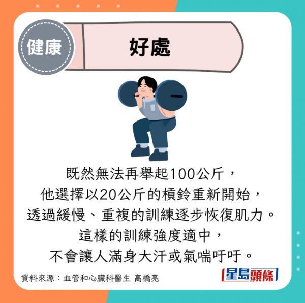 既然無法再舉起100公斤,他選擇以20公斤的槓鈴重新開始,透過緩慢、重複的訓練逐步恢復肌力。這樣的訓練強度適中,不會讓人滿身大汗或氣喘吁吁。