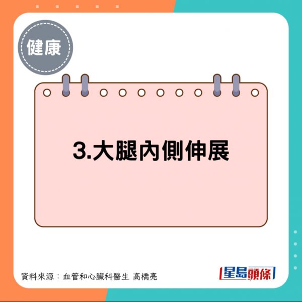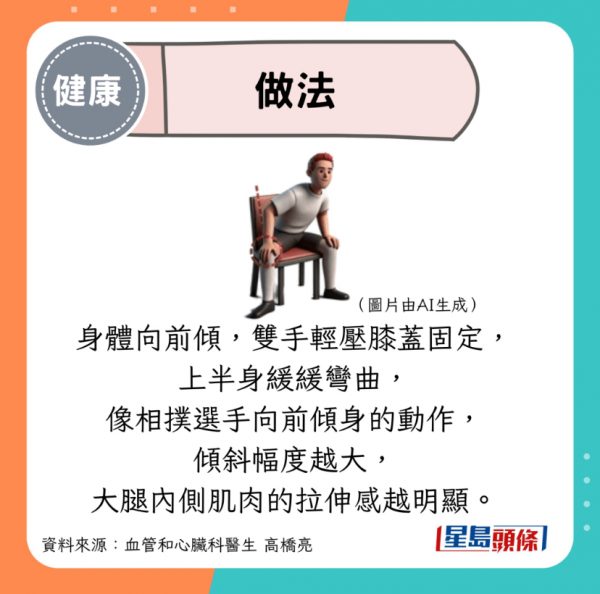 - 身體向前傾,雙手輕壓膝蓋固定,上半身緩緩彎曲,像相撲選手向前傾身的動作,傾斜幅度越大,大腿內側肌肉的拉伸感越明顯。