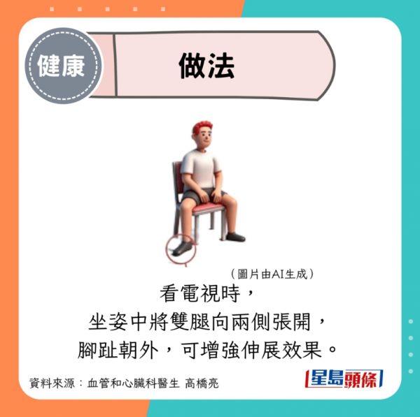 - 看電視時,坐姿中將雙腿向兩側張開,腳趾朝外,可增強伸展效果。
