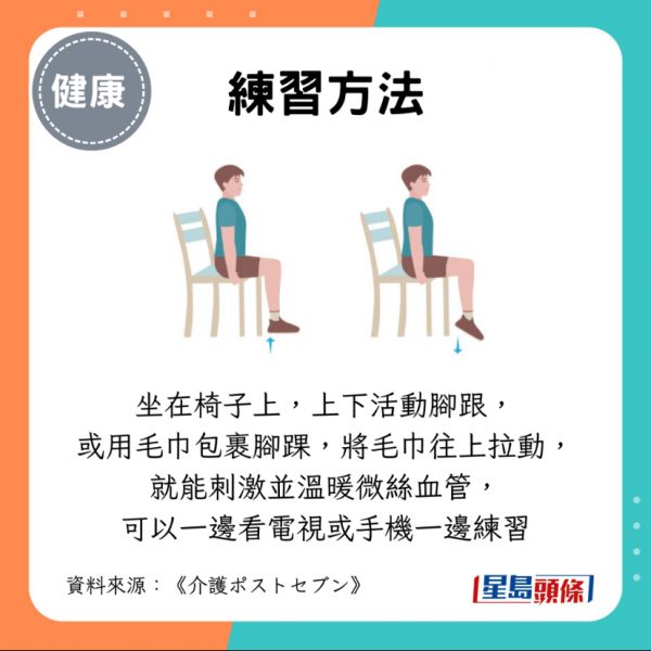 肌肉收緊和放鬆的練習被認為是改善血液循環的最基本方法:坐在椅子上,上下活動腳跟,或用毛巾包裹著腳踝,並將毛巾往上拉動,就能刺激並溫暖微絲血管。練習時可以一邊看電視或手機一邊進行。